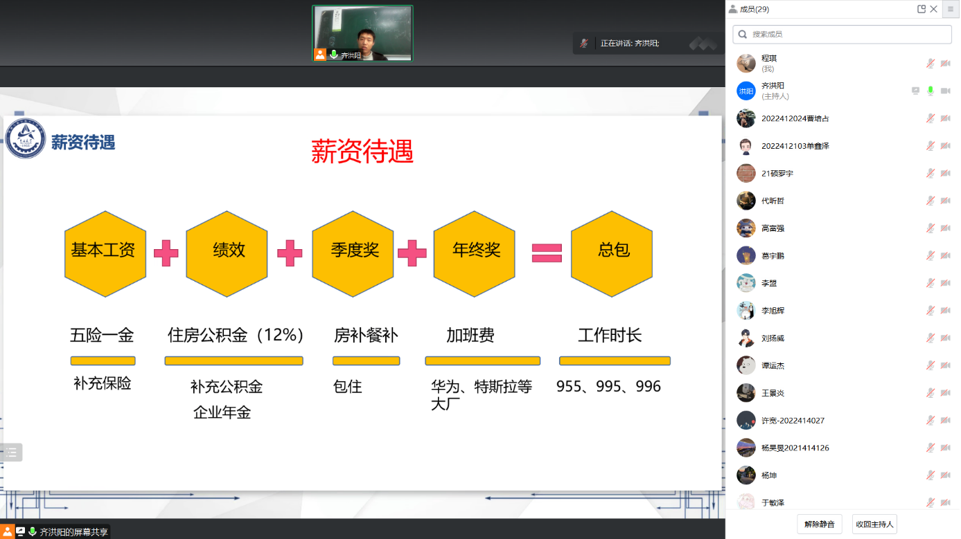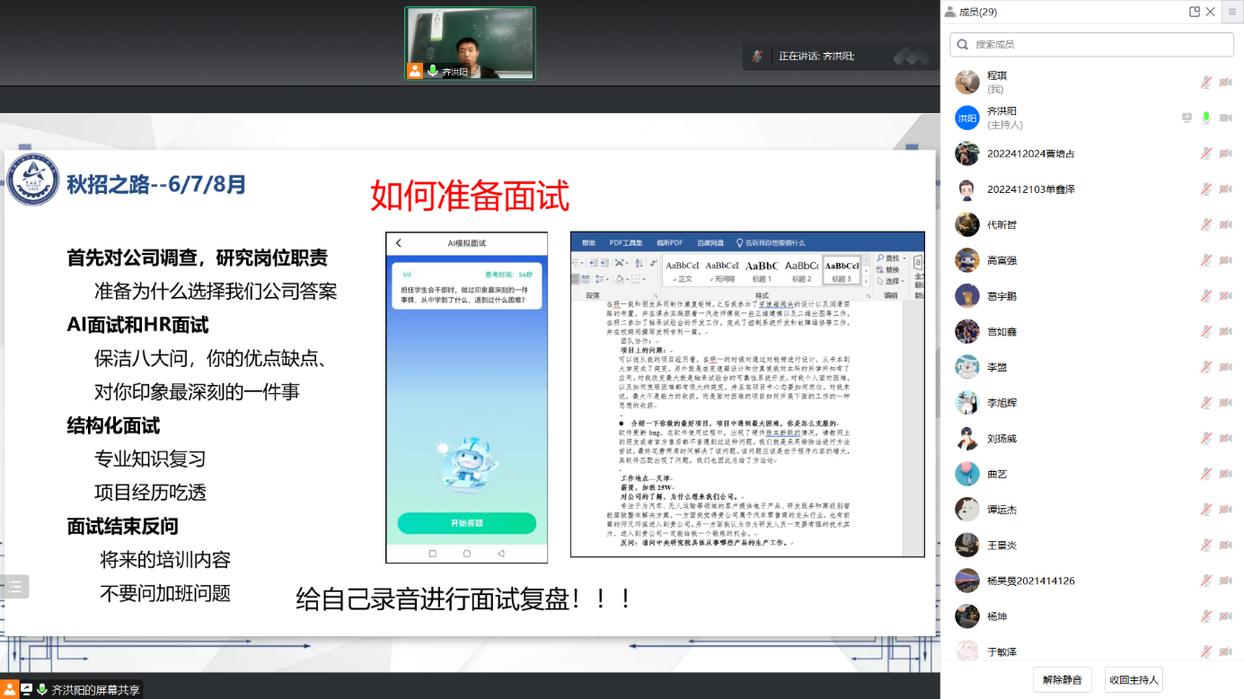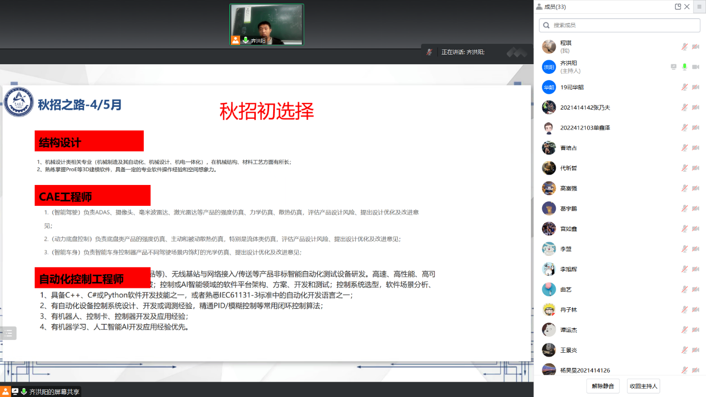 本次就业信息分享会由齐洪阳主讲,齐洪阳已签约中汽研汽车检验中心限公司,有着丰富的就业经验,并将从秋招、面试技巧、薪资待遇和个人经验等几个角度进行分享。他从秋招选择入手,对考公或选调、省内或省外、城市选择、行业选择、研发或职能岗以及控制或结构设计进行了详细的分析与对比,并对结构设计岗、CAE工程师和自动化控制工程师的入职要求和条件进行充分的讲解,叮嘱同学们要对自己的选择有充分的了解和准备。面试技巧方面,齐洪阳从自我介绍准备、简历准备、面试流程和面试准备进行讲解,自我介绍准备三分钟,要有职业规划和岗位认识;简历项目撰写按时间顺序往后排,按照STAR法则或功能进行描述。面试环节中需要提前了解岗位职责,准备AI面试、HR面试、结构化面试以及面试结束后的反问。对于薪资待遇问题,齐洪阳根据中汽研汽车检验中心限公司为大家讲解了薪资的组成结构,并简单介绍了工作时长、加班政策、房补餐补、职业发展、员工关怀以及人才补贴政策。
